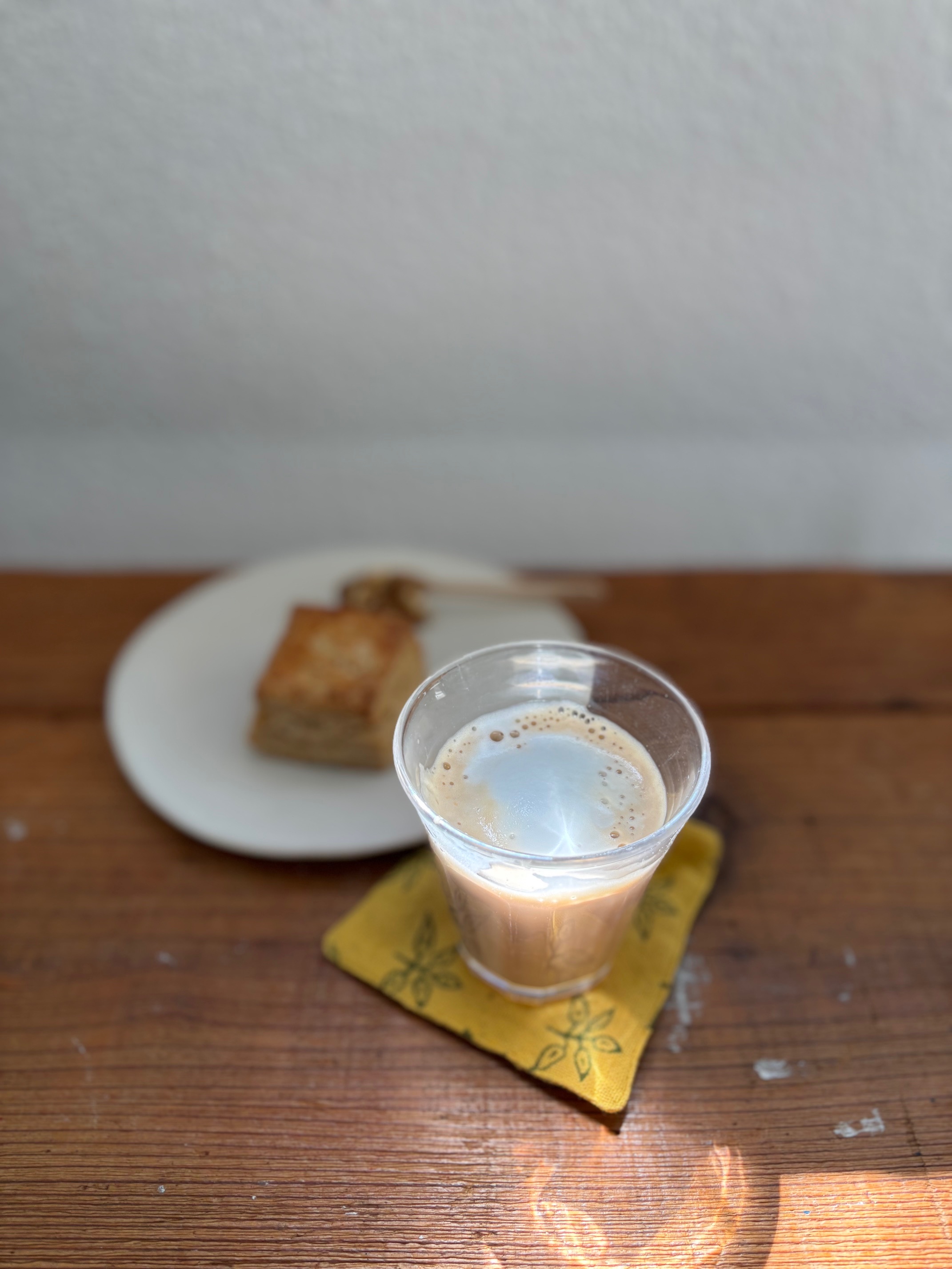 threadのミルク紅茶は空気を含ませ煮込んでいくために牛乳が基本です。豆乳だと沸騰させることが出来ないので、茶葉の味をしっかりとミルクに浸透させることが難しくなります。relieur(ルリユール)のスコーンと相性がとても良いミルクティを是非。写真はカスカラ(コーヒーチェリーの果皮)をブレンドしたカスカラミルクティーとスコーンのサミシュラン。